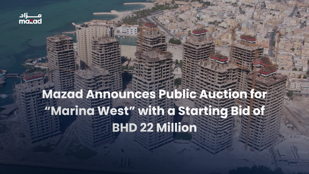 Manama, Kingdom of Bahrain — 29 October 2025 Mazad, under the supervision of the Committee for the Settlement of Stalled Real Estate Development Projects, announced today that the public auction for the partially completed real-estate project “Marina West” will take place on Sunday, 9 November 2025, at 12:00 PM, in the Ministry of Justice, Islamic Affairs and Waqf building, Diplomatic Area – First Floor.